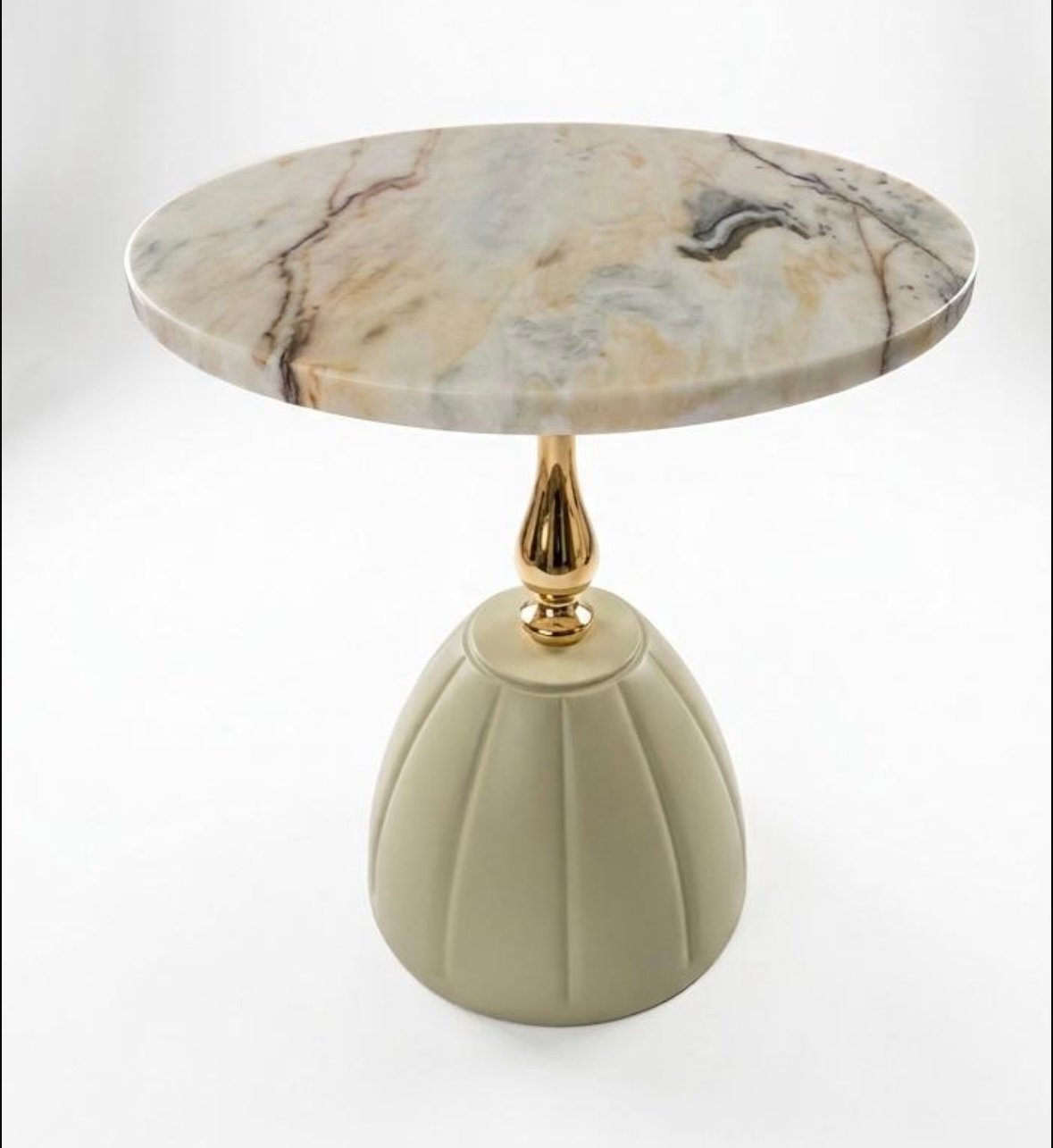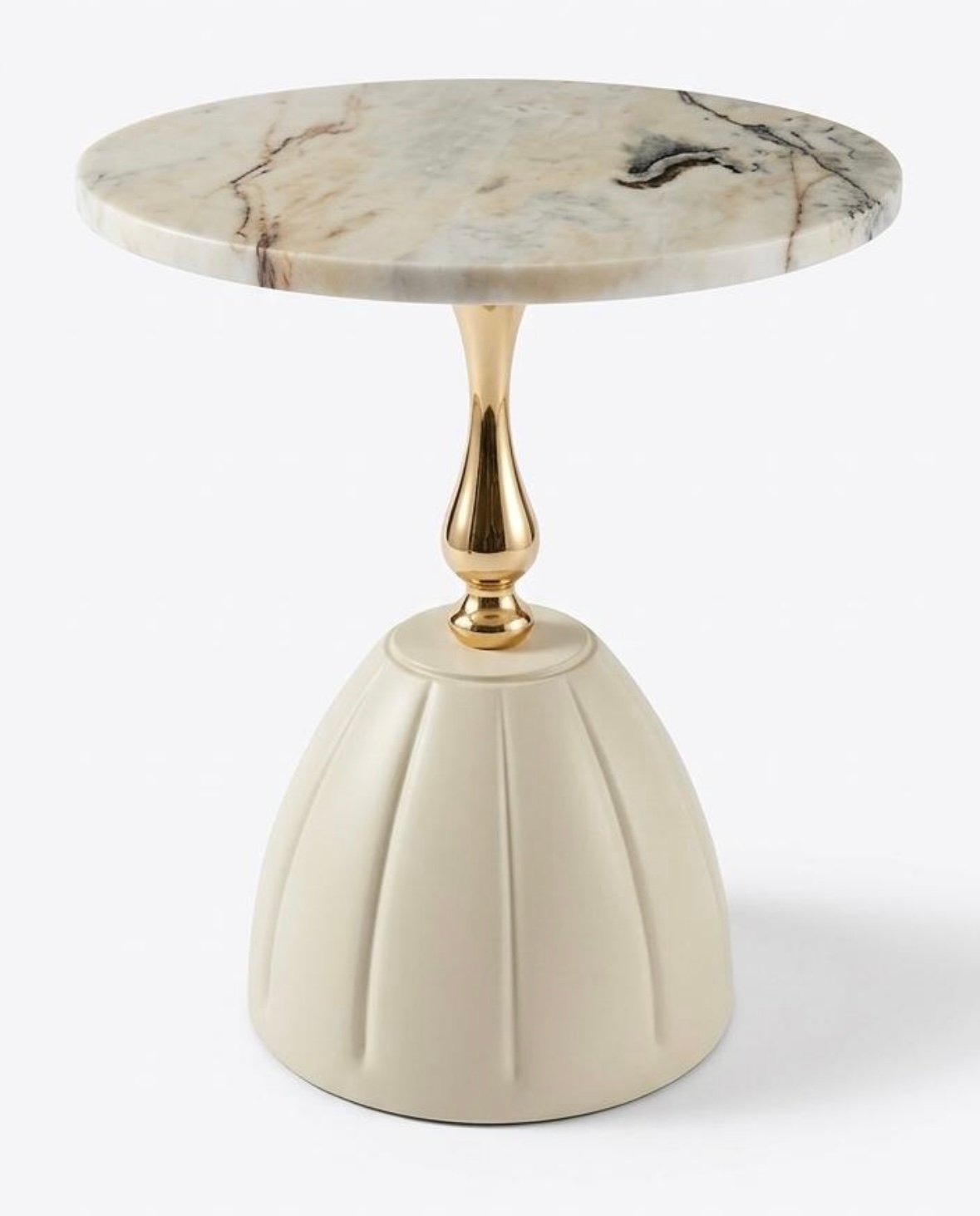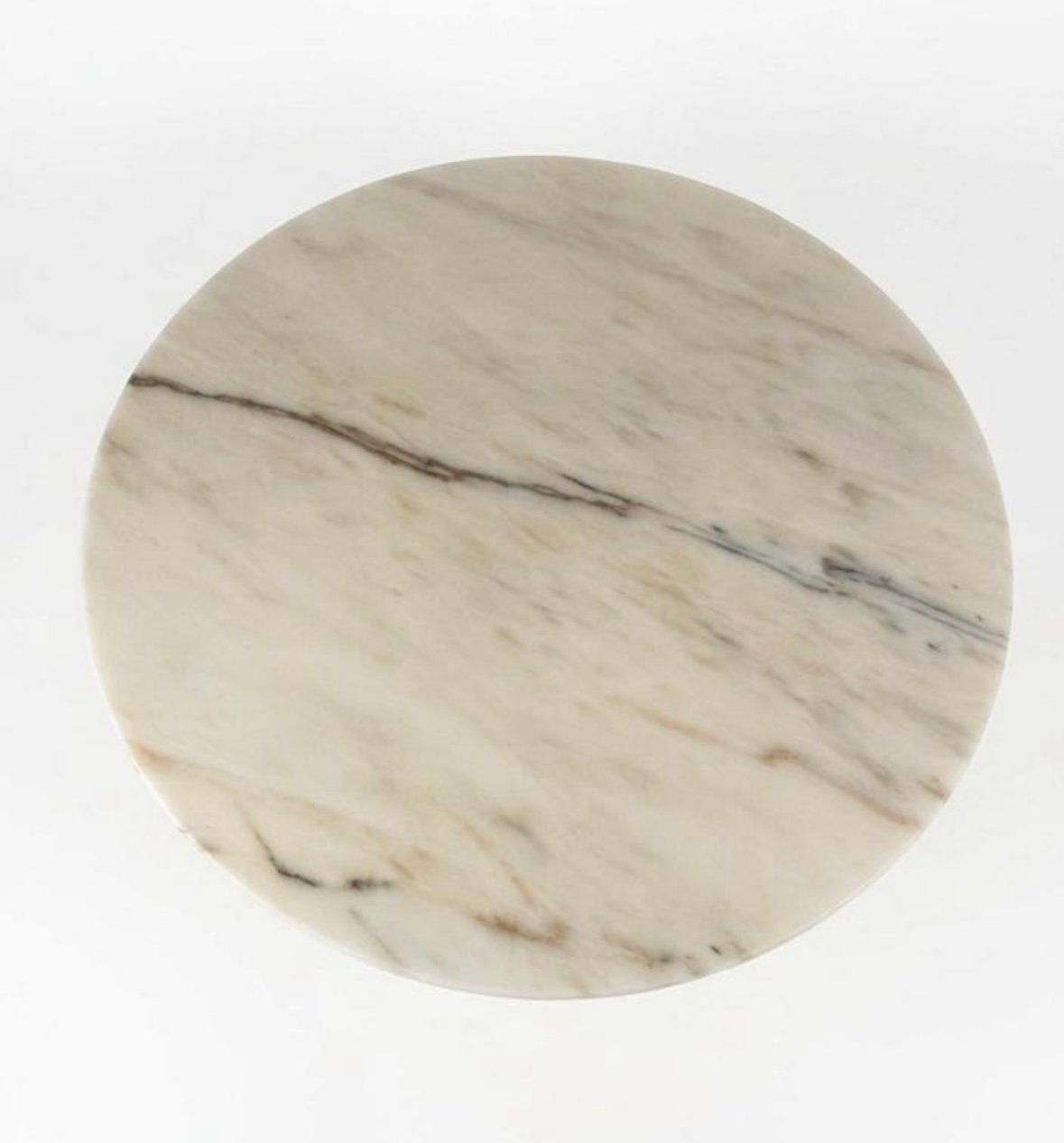 Collection été 2026. Table basse “Ambassador”. Plateau en marbre rose d’Estremoz de 44 cm de diamètre et 2 cm d’épaisseur. Pied de table en métal et plastique peint avec une base au sol de 31 cm de diamètre. Hauteur de la table assemblée = 51 cm.