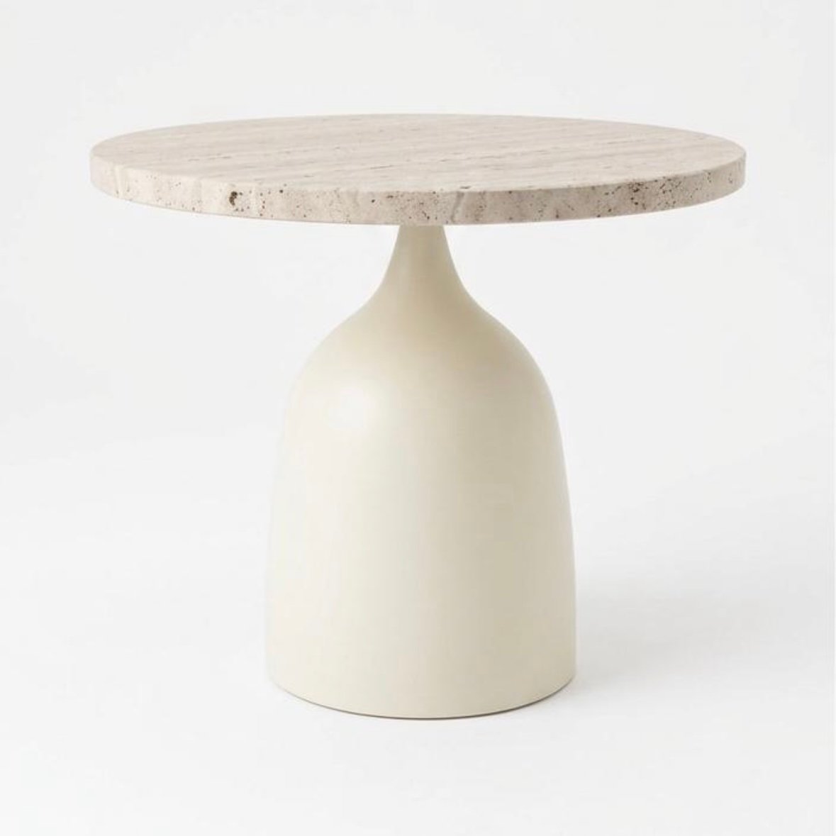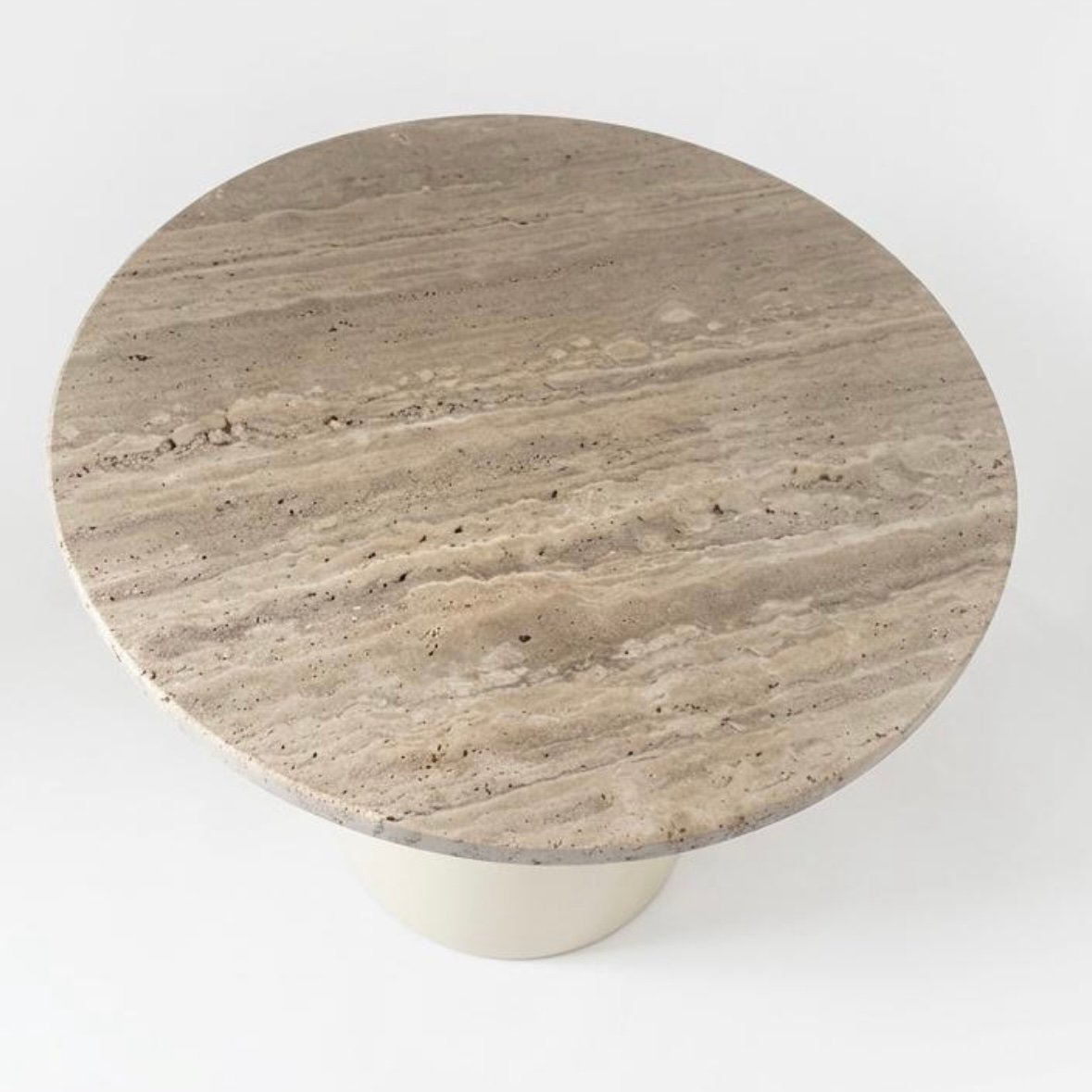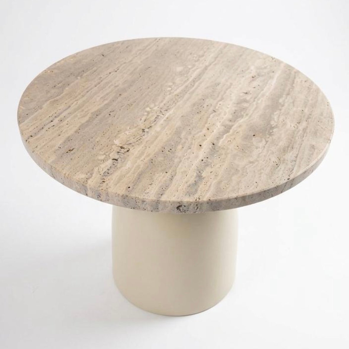 Collection été 2026. Table basse “Intense”. Plateau en travertin de 44 cm de diamètre et 2 cm d’épaisseur. Pied de table en métal peint avec une base au sol de 28 cm de diamètre. Hauteur de la table assemblée = 41 cm.