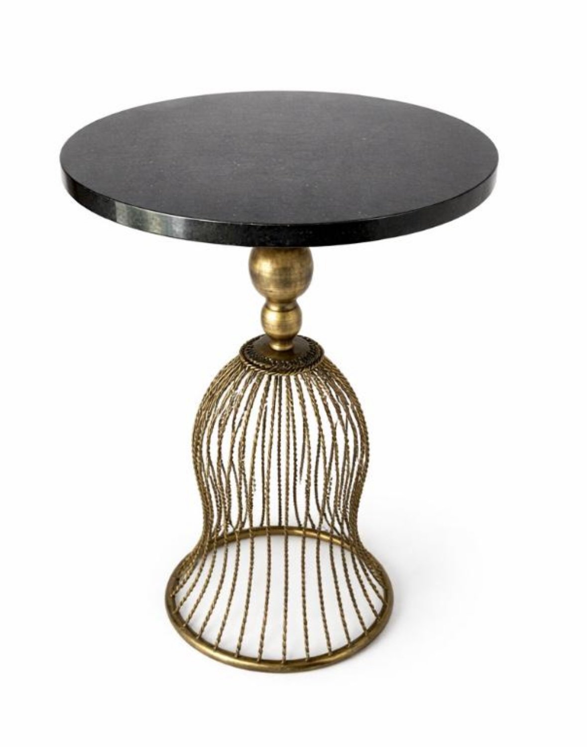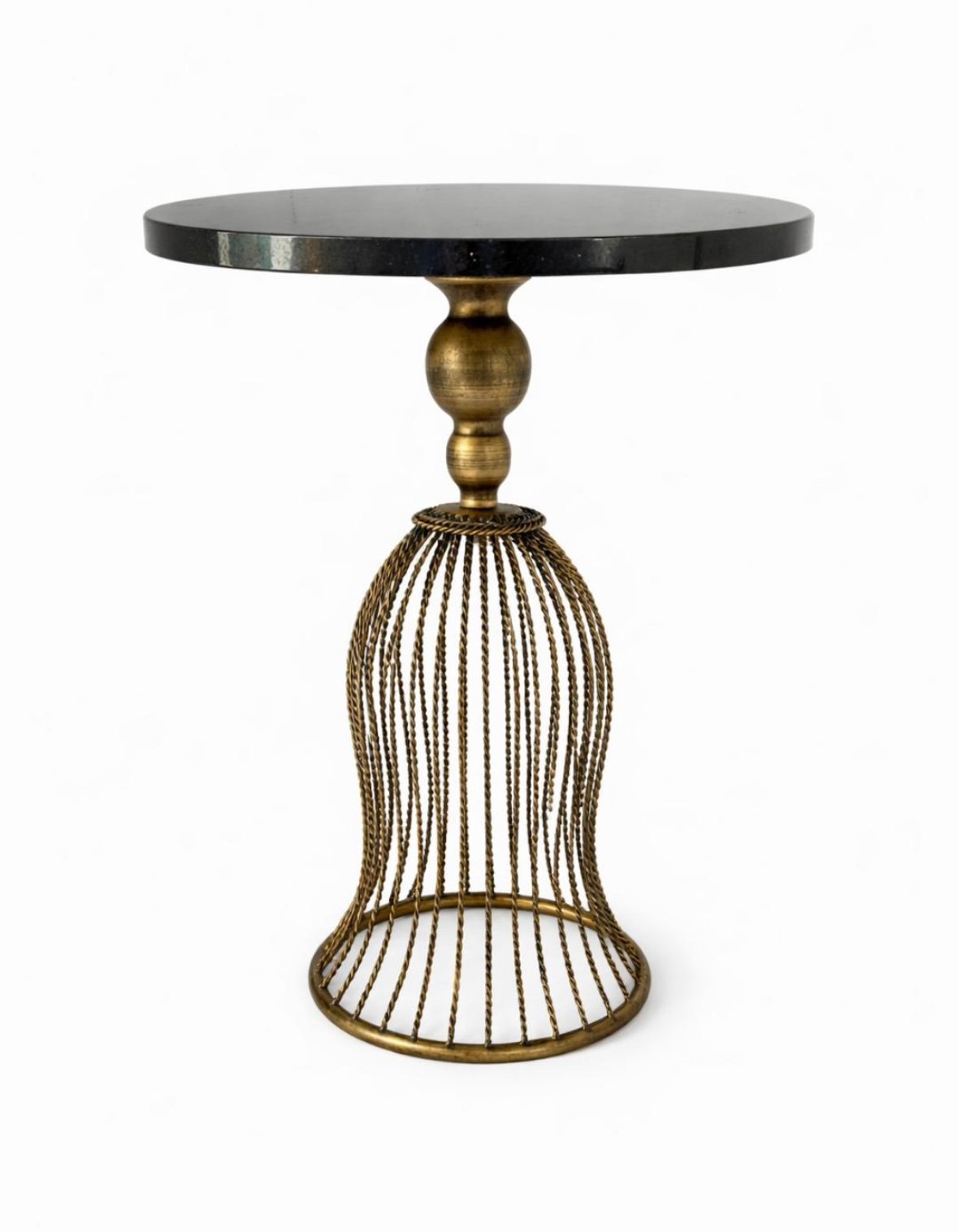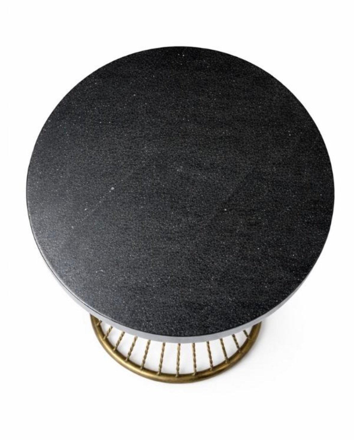 Collection été 2026. Table basse “Rome”. Plateau en granit noir Galaxy de 44 cm de diamètre et 2 cm d’épaisseur. Pied de table en métal peint avec une base au sol de 26 cm de diamètre. Hauteur de la table assemblée = 58 cm.